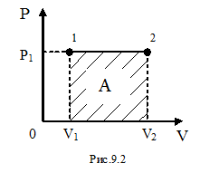 Рассмотрим изохорический процесс. При изохорическом процессе объём газа не изменяется, приращение объёма равно нулю, следовательно, работа газа равна нулю. Поскольку работу в любом случае можно определить, пользуясь формулой (9-8), для математической интерпретации работы удобно изображать любой процесс на диаграмме (P,V). Работа на такой диаграмме равна площади фигуры под кривой, изображающей тот или иной процесс, происходящий с газом. Рассмотрим изобарический процесс (рис. 9.2). Используя формулу (9-8) найдём работу газа при переходе из состояния 1 в состояние 2: Так как для данного количества вещества давление остаётся постоянным при изобарическом процессе, то его можно вынести за знак интеграла, тогда получим: