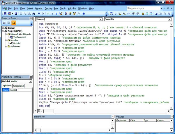 Для запуска редактора кода VBA в Microsoft Word используем команду Разработчик ► Код ► В открывшемся окне создаём модуль (имя по умолчанию – Module1) командой меню Insert ► Module, в котором размещаем текст описания процедуры SummOtr, что показано на рисунке 6. Запуск программы на выполнение осуществляется нажатием функ-циональной клавиши F5 либо командой меню Run ► Если программа набрана без ошибок, доступен файл с исходными данными, то после запуска программы мы увидим на поле документа сообщение «Смотри файл F:\Kursovaya rabota Ivanov\rez.txt», сигнализирующее о завершении формирования файла результатов. Рассмотренный пример программы внедрён в данный документ. Просмотр кода и запуск программы можно осуществить описанным выше способом. Запуск программы можно также осуществить щелчком по следующей внедрённой командной кнопке:.