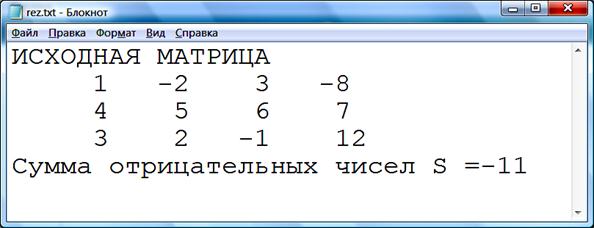 Рис. 4. Схема алгоритма Например, создадим с помощью текстового редактора Блокнот файл исходных данных с матрицей размерностью 3´4. Содержимое файла представлено на рисунке 5. В качестве разделителей данных могут использоваться символы пробела, табуляции и конца строки. Созданный файл с исходной матрицей сохраним, например, под именем F:\Kursovaya rabota Ivanov \ matr.txt.