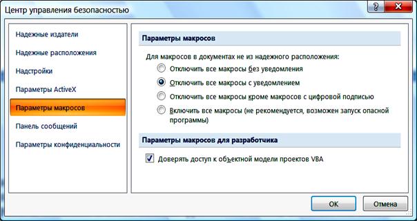 Если запуска программы не происходит, то, скорее всего, настройками безопасности установлено отключение макросов. Параметры управления запуском макросов можно изменить в диалоговом окне Центр управления безопасностью, показанном на рисунке 8. Чтобы после установки параметров изменения вступили в силу, программу Word следует закрыть и запустить заново. Вызов этого окна производится одним из двух способов: командой Разработчик ► Код ►