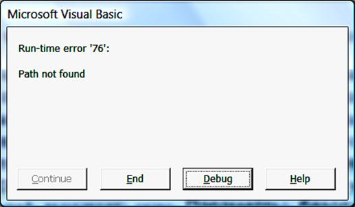 Параметр «Включить все макросы…» не рекомендуется использовать, так как возможен запуск нежелательных программ-макровирусов. Более предпочтителен режим работы с установленным параметром «Отключить все макросы с уведомлением». При открытии в этом режиме документа, содержащего макросы, непосредственно под лентой появляется панель Возможно, что на экране возникнет сообщение об ошибке выполнения программы, показанное на рисунке 10. В данном случае ошибка вызвана отсутствием открываемого файла исходных данных. Нажатие кнопки Debug позволяет перейти в режим отладки программы и увидеть выделенную жёлтым цветом строку, при выполнении которой возникла ошибка. А наведение указателя мыши на имя переменной или на предварительно выделенный фрагмент выражения позволяет увидеть всплывающую подсказку с его значением. Таким приёмом очень удобно пользоваться не только при возникновении ошибок, но и при пошаговой отладке программы. Для исполнения каждого очередного оператора следует нажать функциональную клавишу F8.