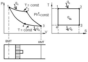 В 1824 французский инженер С. Карно предложил цикл идеального теплового двигателя, состоящий из двух изотерм и двух адиабат и представляющий собой замкнутый процесс, который совершает рабочее тело при наличии двух источников теплоты: нагревателя (горячего источника) с температурой Т1 и холодильника (холодного источника) с температурой Т2. Причём Т1=const и Т2=const, т.к. предполагается, что теплоёмкость каждого из источников теплоты столь велики, что отъём рабочим телом теплоты от ВИТ и передача её НИТ практически не меняет их температуры. Прямой цикл Карно, являясь наиболее совершенным, в р, v –диаграмме изображён на рис.5.2. Допустим, 1 кг раб. тела находится цилиндре под поршнем. Стенки полностью теплоизолируют цилиндр, что обеспечивает возможность осуществления адиабатного процесса изменения состояния газа. Однако в случае необходимости газ может приходить в соприкосновение с 2-мя источниками теплоты. Начальное состояние газа в р, v - диаграмме характеризуется т.1, соответствующей крайнему левому положению поршня цилиндре (ВМТ). Первый такт цикла, в течении которого цилиндр находится в контакте с нагревателем (ВИТ), состоит в расширении газа. Газ создающий высокое давление давит на поршень, стремясь вытолкнуть его из цилиндра. В результате поршень перемещается и коленчатый вал поворачивается: совершая рабочий ход двигателя. Этот такт является изотермическим; при этом, чтобы преодолеть стремление газа к охлаждению по мере расширения, к нему необходимо подводить энергию от нагревателя. Поэтому данный этап работы двигателя является не только рабочим — он характеризуется также процессом поглощения газом теплоты, отобранной у ВИТ.