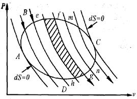 Проведем большое количествоблизко расположенных адиабат, которые разобьют произвольный цикл на бесконечно большое количество элементарных циклов efgh, fmng и т. д. Каждый такой элементарный цикл состоит из двух адиабат и двух элементарных отрезков контура данного цикла. Ввиду бесконечно малой длины этих отрезков изменения температуры по Рис. 6.1 ним так же бесконечно малы. Следовательно, в пределе эти отрезки можно считать изотермами, а циклы элементарными циклами Карно. Совокупное действие элементарных циклов одинаково с действием кругового цикла ABCD. Работа расширения по адиабате fg цикла efgh равна работе сжатия по адиабате gf цикла fmng. Таким образом, адиабатные процессы в конечном счете не влияют на величину работы, теплота же во время этих процессов не подводится и не отводится. Суммарное действие элементарных циклов сводится к совокупному действию элементарных процессов ef, fin, ng, gh и т. д., т. е. одинаково с действием кругового процесса по контуру ABCD. Для каждого элементарного цикла Карно справедливо соотношение (6.1). Суммируя эти соотношения для всех элементарных циклов, для рассматриваемого произвольного цикла получим В пределе для бесконечно большого числа этих элементарных циклов, т.е. для цикла ABCD С учетом (6.2), имеем Известно, если интеграл по замкнутому контуру равен нулю, то подынтегральное выражение представляет собой полный дифференциал некоторой функции состояния S, называется энтропией, т.е.