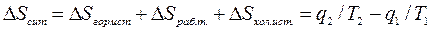 Это состояние справедливо для любых обратимых и необратимых циклов, осуществляемых между двумя источниками теплоты. Возрастание энтропии cистемы при необратимых процессах связано с тем, что энтропия рабочего тела за цикл не изменяется, а уменьшение энтропии горячих источников меньше по абсолютной величине, чем увеличение энтропии холодных источников теплоты. Таким образом, в результате осуществления необратимого цикла энтропия изолированной системы возрастает dScucm > 0. Таким образом, какие бы процессы не протекали в изолированной системе, ее энтропия не может уменьшаться: здесь знак равенства соответствует обратимым процессам, а знак неравенства - необратимым. Отсюда следует важный вывод: изолированная система, достигшая равновесного состояния, в дальнейшем в этом состоянии и пребывает, т.е. является неспособной к самопроизвольному изменению состояния. В самом деле, любой самопроизвольный процесс необратим и, следовательно, протекает с ростом энтропии. Однако энтропия изолированной системы имеет максимум в состоянии равновесия, следовательно, в равновесной изолированной системе невозможны самопроизвольные процессы. Такм образом, самопроизвольные процессы продолжаются в изолированной системе до тех пор, пока энтропия системы не достигнет максимума. По достижении состояния равновесия, которому соответствует максимально возможное для данной системы значение энтропии, самопроизвольные процессы в системе прекращаются и система пребывает в состоянии равновесия.