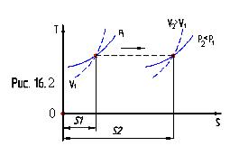 Физическая сущность эффекта дросселирования реалього газа или пара состоит в следующем. На основании равенства h1 = h2 можно написать U1 + p1 . υ1 = U2 + p2 . υ2, (16.1) или U1 – U2 = p2 . υ2 – p1 . υ1, (16.2) Откуда следует, что работа проталкивания (правая часть уравнения (16.40) совершается за счет уменьшения внутренней энергии реального газа или пара. Внутренняя энергия реального газа складывается из двух частей: из кинетической (функция температуры) и потенциальной (функция температуры и объема). В большинстве случаев (практических) процесс дросселирования проходит при затрате работы проталкивания p2 . υ2 – p1 . υ1, что обуславливает увеличение внутренней энергии газа или пара. В зависимости от соотношения абсолютных значений прироста работы проталкивания, потенциальной части внутренней энергии и кинетической части внутренней энергии на основании (16.40) возможны следующие случаи: 1. Работа проталкивания p2 . υ2 – p1 . υ1 по абсолютному значению меньше прироста потенциальной части внутренней энергии, в этих условиях кинетическая часть внутренней энергии уменьшается, поэтому температура газа снижается Т2 < Т1. 2. Работа проталкивания p2 . υ2 – p1 . υ1 по абсолютному значению больше прироста потенциальной части внутренней энергии, избыток работы затрачивается на увеличение кинетической энергии, поэтому температура газа возрастает Т2 > Т1. 3. Если работа проталкивания p2 . υ2 – p1 . υ1 равна приросту потенциальной части внутренней энергии, то кинетическая часть внутренней энергии газа, а следовательно, и его температура остаются неизменными Т2 = Т1. Явление, при котором температура реального газа до дросселя и после него остается неизменной (Т2 = Т1), называется инверсией газа, а температура, при которой это явление происходит, называют температурой инверсии и обозначают Тин. Таким образом, при дросселировании реальных газов энтальпия для начальных и конечных значений остается постоянной (h1 = h2), но энтропия и объем увеличиваются, давление падает, а температура может уменьшаться, увеличиваться или же в частном случае оставаться постоянной.