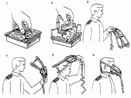 Стационарная кислородная система пилотской кабиныКИСЛОРОДНОЕ ОБОРУДОВАНИЕ. Кислородное оборудование самолета подразделяется на стационарное и переносное. Стационарное оборудование представлено стационарной кислородной системой пилотской кабины и стационарной кислородной системой пассажирской кабины. Переносное оборудование представлено, как правило, баллонами фирмы SKOTT (AVOX). Все места в кабине экипажа снабжены быстронадевающимися кислородными масками. Конструкция. Кислородная система для лётного экипажа – «газовая», состоит из масок, трубопроводов (шлангов) и баллона с кислородом, обычно расположенного под полом кабины пилотов. Кислородная маска уложена в специальный контейнер со шторками. В маске имеется микрофон и клапан внешней подачи кислорода, который используется с противодымными очками для удаления дыма из-под них. Маски расположены рядом с каждым креслом в кабине пилотов. Порядок использования. Сжать красные рычаги (рис. 1). Вытащить маску из контейнера (рис. 2 и 3). Удерживая красные рычаги сжатыми, надеть маску на голову и прижать к лицу (рис. 4 и 5). Отпустить красные рычаги (рис. 6).