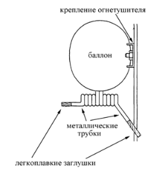 Стационарный химический огнетушитель расположен под раковиной в каждой туалетной комнате, и представляет собой сферический стальной контейнер диаметром примерно 10 сантиметров, заполненный огнегасящим составом. Огнетушитель имеет две металлические трубки, направленные в мусорный контейнер и пространство вокруг него. Концы трубок запаяны легкоплавкими заглушками. При температуре свыше +70 градусов по Цельсию заглушки расплавляются, и огнегасящий состав из огнетушителя распыляется в мусорный контейнер и пространство вокруг него.