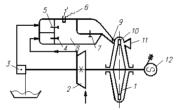 1. Газовая турбина; 2. Компрессор; 3. Топливный насос; 4. Управляющий клапан сжатого воздуха; 5. Топливный клапан; 6. Электрическая свеча; 7. Сопловой клапан; 8. Камера сгорания; 9. Сопловой канал; 10. Лопатки турбины; 11. Выпускной патрубок; Рис. 26.3 12. Электрогенератор.