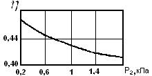 На рис. 28.4 приведена зависимость ηцикла Ренкина от начальной температуры Т1 для начального давления p1=16670 кПа (=170ати) и давления пара в конденсаторе p2=4 кПа (=0,04ати). Из рисунка видно, что увеличением температуры Т1 η увеличивается. Кроме того, при увеличении начальной температуры пара Т1, уменьшается удельный расход и пара. Однако повышение начальной температуры пара рис. 28.4 ограничивается свойствами металла. В настоящее время используется пар с температурой до 565° С. в) Влияние конечного давления в конденсаторе При постоянных значениях начальных параметров пара T1 = const и p1 = сonst уменьшение конечного давления в конденсаторе приводит к повышению η цикла, т.к. в этом случае возрастает располагаемый температурный интервал цикла. Для уменьшения конечного давления p2 на выходе пара из турбины создают вакуум с помощью конденсатора. На рис. 28.5 приведена зависимость ηцикла Ренкина от давления p2. График построен для начальных параметров p1 = кПа (= 170ати) и Т1 = 5500С.