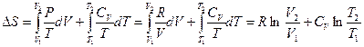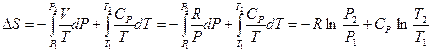 Уравнения (II, 20) и (II, 21) являются полными дифференциалами энтропии как функции переменных V, Т или P, Т. Коэффициенты этих уравнений — частные производные энтропии по соответствующим переменным. Подставив в уравнение (II, 20) значения калорических коэффициентов для одного моля идеального газа: l = P = RT/V (уравнение (I, 40)) и h = – V = – RT/P (уравнение (I, 42)) и полагая СV и СP независимыми от температуры (что допустимо лишь в небольших температурных интервалах), получим после интегрирования в известных пределах: