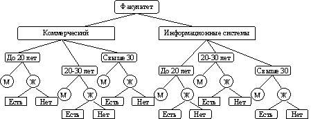 Пример 2.10. Поставлена задача - создать иерархическую систему классификации для информационного объекта "Факультет", которая позволит классифицировать информацию обо всех студентах по следующим классификационным признакам: факультет, на котором он учится, возрастной состав студентов, пол студента, для женщин - наличие детей. Система классификации представлена на рис.2.4 и будет иметь следующие уровни:
