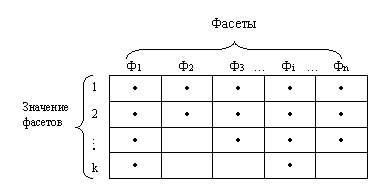Рис 2.5. Фасетная система классификации Процедура классификации состоит в присвоении каждому объекту соответствующих значений из фасетов. При этом могут быть использованы не все фасеты. Для каждого объекта задается конкретная группировка фасетов структурной формулой, в которой отражается их порядок следования: Ks=(Ф1, Ф2,..., Фi,..., Фn), где Фi- i-й фасет; n - количество фасетов. При построении фасетной системы классификации необходимо, чтобы значения, используемые в различных фасетах, не повторялись. Фасетную систему легко можно модифицировать, внося изменения в конкретные значения любого фасета. Достоинства фасетной системы классификации: