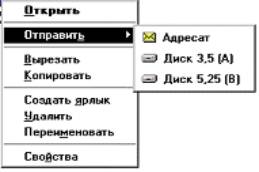 Запомните! При работе с объектами в среде Windows сперва выделяете (выбираете) объект, а затем производите над ним действие. В среде Windows существует множество объектов, с которыми придется работать пользователю, например, с объектами файловой системы, с объектами графического интерфейса и т.д. В дальнейшем вы познакомитесь с наиболее типичными представителями разных классов подобных объектов. Объектная ориентация среды Windows проявляется для пользователя сразу при знакомстве с технологией работы в ней. Щёлкнув по любому объекту правой кнопкой мыши, вы получаете доступ к командам контекстного меню, один из вариантов которого представлен на рис. 12.1. Контекстное меню объекта предоставляет пользователю возможность: ознакомиться со свойствами этого объекта Например, если объектом является документ, то вы получаете информацию о том, в какой среде он создавался, сколько места занимает на диске, где хранится, кто и когда его создал и т.д. выполнить действия, возможные для этого объекта, выбором из этого меню соответствующих команд. Следует отметить, что объекты, относящиеся к одному классу, могут выполнять одни и те же действия. Например, если объектом является документ, то независимо от программной среды, где он создавался, его можно вырезать, копировать, удалять, переименовывать и осуществлять прочие указанные на рис 12.1 действия.