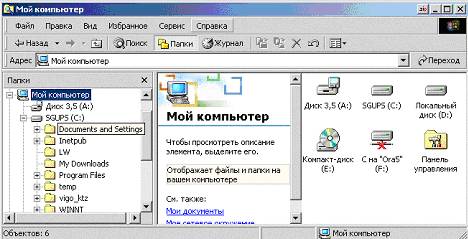 ПРОГРАММНЫЕ СРЕДСТВА WINDOWS 98 · Программа Проводник · Настройка среды Windows · Стандартные прграммы прикладного назначения · Стандартные программы служебного назначения Проводник в своем первоначальном значении определялся как программа-обозреватель локальных и сетевых ресурсов персонального компьютера. Его функции во многом сродни функциям программ-оболочек операционной системы MS DOS, таких, как, например, Norton Commander. Проводник (WindowsExplorer) в среде Windows 98 - программа (приложение), с помощью которой пользователь может отыскать любой объект файловой системы (папку или файл) и произвести с ним необходимые действия. С помощью Проводника можно запускать приложения, открывать документы, перемещать или копировать файлы и папки, форматировать дискеты, просматривать Web-страницы в Интернет и др. Интерфейс Проводника сделан предельно понятным для пользователя. Внешний вид окна Проводника может изменяться, но его функции при этом практически не меняются.