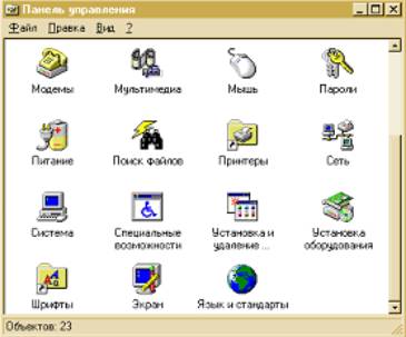 Операционная система Windows предоставляет пользователю ряд инструментов для настройки своей среды. Все они находятся в папке Панель управления. Доступ к этой папке осуществляется через Главное меню. После нажатия кнопки "Пуск" в меню следует выбрать пункт Настройка, а затем в подменю - пункт Панель управления. Все инструменты, находящиеся в папке Панель управления, можно условно разделить на два класса: класс инструментов для системной настройки. Эти инструменты используются для настройки оборудования и установки приложений. К ним можно отнести: установку или удаление программ; подключение двух или более мониторов; установку, тестирование и конфигурирование оборудования; изменение настройки Интернет; установку паролей и др.; класс инструментов для настройки пользовательского интерфейса. Эти инструменты позволяют изменять внешний облик системы. К ним можно отнести; установку даты и времени; изменение оформления Рабочего стола (звук, фон, заставку и др.); поддержку необходимого языка; выбор видов указателя мыши и др.; На рис. 12.22 представлена папка Панель управления, которая содержит значки программ для реализации определенной функции. Щелчком мыши по значку вызывается соответствующая программа, которая в диалоговом режиме предлагает пользователю установить необходимые параметры настройки.
