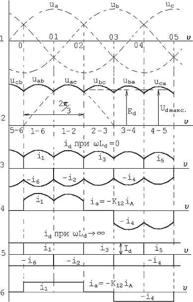 Многофазные выпрямители Многофазные выпрямители применяются, как правило, только в промышленной и специальной аппаратуре. Обычно в промышленной аппаратуре применяются трехфазные выпрямители двух типов – трехфазный выпрямитель и выпрямитель Ларионова. Принципиальная схема и осциллограммы напряжения в различных точках выпрямителя приведены на рисунке 9.