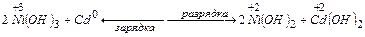 При разрядке: А- Cd0 - 2ē + 2OH- → Cd(OH)2 K+ Ni2+3O3∙H2O → 2Ni+3OOH + 2H2O + 2ē → 2Ni(OH)2+ 2OH-