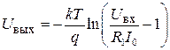 Логарифмирующими называются преобразователи (как частный случай усилители), имеющие логарифмическую передаточную характеристику (ЛПХ). Они применяются для сжатия большого динамического диапазона входных сигналов в измерительных, радиолокационных и других устройствах. Для построения логарифмирующих схем усиления на ОУ используются полупроводниковые диоды и транзисторы, содержащие p-n переходы с экспоненциальной вольт-амперной характеристикой. Простейшая схема такого преобразователя и его характеристика приведены на рис. 4. Прямая ВАХ диода приближенно описывается выражением: