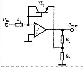 где Логарифмирующий преобразователь (рис. 4) работает лишь при положительных значениях входного сигнала. Для логарифмирующего преобразователя при отрицательном входном сигнале необходимо изменить полярность диода VD 1, включенного в обратную связь. Недостатком данной схемы является резкое увеличение коэффициента передачи при значении входного сигнала, близком к нулю.