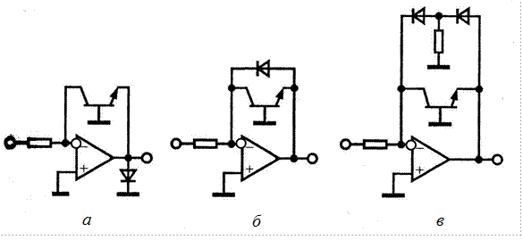 Рис. 8. Применение диодов для защиты транзистора: а – ограничитель выходного напряжения; б – ограничитель в цепи обратной связи; в – Т-образный ограничитель для уменьшения токов утечки Можно показать, что при уменьшении входного тока уменьшается дифференциальное сопротивление транзистора Схема с транзистором в диодном включении, как правило, оказывается устойчивой при использовании полностью скорректированного ОУ. Менее устойчива схема с заземленной базой, что объясняется дополнительным усилением в петле обратной связи. Одной из основных причин неустойчивости является дополнительный фазовый сдвиг (рис. 9), вносимый конденсатором С 1, входной емкостью и емкостью коллектор – база транзистора. Можно устранить неустойчивость, включив конденсатор С 2 между инвертирующим входом и выходом ОУ; конденсатор ограничивает полосу пропускания логарифмирующего усилителя на уровне 1/(2p r э С 2). Емкость конденсатора С 2 может оказаться довольно большой (порядка 1 нФ), так как сопротивление r э при больших входных токах невелико. Уменьшить необходимую емкость конденсатора можно, увеличив эффективное значение r эвключением дополнительного резистора R 2(рис. 10). В приведенных выше соотношениях эффективное значение r э следует заменить на (R 2 + r э).