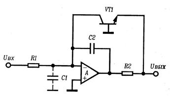 Рис. 4. Логарифмирующий преобразователь: Согласно (4) при изменении входного напряжения на декаду приращение выходного напряжения составляет На отклонение передаточной характеристики от логарифмической влияет как невыполнение условия Учет объемного сопротивления диода приводит к соотношению