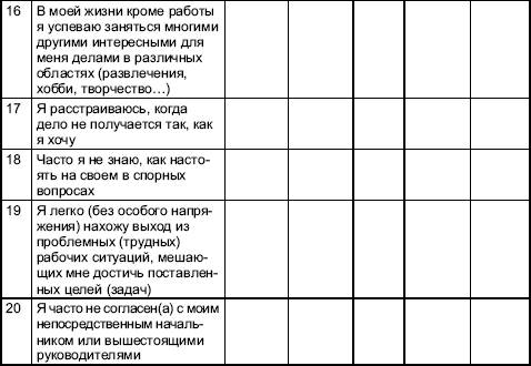 Маклин [14], русскоязычная адаптация Н. Водопьяновой Данная шкала измеряет восприимчивость к организационному стрессу (ОС), связанную с недостаточным умением общаться, принимать ценности других людей, адекватно оценивать ситуацию без ущерба для своего здоровья и работоспособности, негибкостью поведения и пассивностью по отношению к активным формам отдыха и восстановления жизненных сил. Чем выше показатель ОС, тем больше уязвимость к рабочим стрессам, чаще переживания дистресса, таких стресс–синдромов, как психическое выгорание, хроническая усталость, синдром менеджера [1]. Высокий уровень ОС связан с предрасположенностью к поведению типа «А» [13]. Методика позволяет определить общий индекс ОС и пять дополнительных показателей: • способность самопознания (когнитивность); • широта интересов; • принятие ценностей других; • гибкость поведения; • активность и продуктивность деятельности. Инструкция: внимательно прочитайте представленные ниже утверждения и оцените степень вашего согласия с ними, используя шкалу от «абсолютно верно» до «абсолютно неверно».