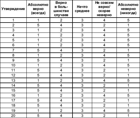 1. Способность самопознания (когнитивность): утверждения 4, 9, 13, 18. 2. Широта интересов: утверждения 2, 5, 7, 16. 3. Принятие ценностей других: утверждения 3, 8, 14, 20. 4. Гибкость поведения: утверждения 1, 11, 17, 19. 5. Активность и продуктивность: утверждения 6, 10, 12, 15. Ответы на утверждения субшкал оцениваются также в соответствии с общим «ключом».