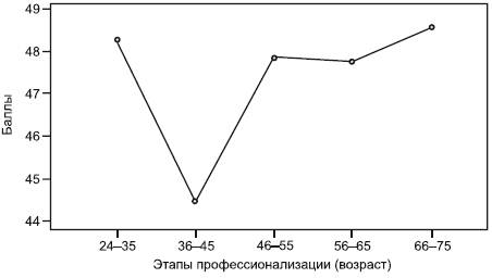 Рис. 3.1. Показатель организационного стресса на разных возрастных этапах профессионализации