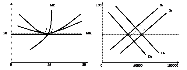 Рис. 6.6.а) Довгострокова рівновага конкурентної фірми Рис. 6.6.б) Реакція галузі на зменшення попиту Стан довгострокової рівноваги може існувати доти, поки не змінюються зовнішні умови. Уявімо собі, що вони змінилися. Нехай, наприклад, має місце довгострокове зменшення ринкового попиту на продукцію фірми. На рис. 6.6.а наведений ряд кривих, що описують поведінку типової фірми. На рис. 6.6.б зображено графік попиту та пропозиції для всього ринку в цілому. У початковий момент часу і фірма, і галузь знаходяться у стані довгострокової рівноваги за ціни, яка дорівнює 50 y.o.. Потім відбувається переміщення кривої попиту в положення D2. На короткостроковому тимчасовому інтервалі ціна падає до 40 грн. (точка перетину D2 і S1). Короткострокова реакція фірми відображається в переміщенні вниз по кривій її граничних витрат. Оскільки ціна все ще вище за середні змінні витрати, фірма не припиняє виробництво. Через визначений час деякі фірми, що потерпають від збитків, залишають галузь. У результаті крива пропозиції переміщується в положення S2, а ринкова ціна повертається на колишній рівень. Типові фірми функціонують беззбитково.