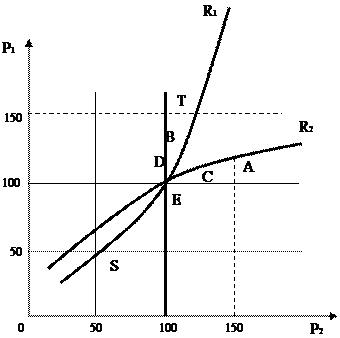 Рис.8.2. Теорія олігополії Бертрана де: R1 – крива реакції 1-ї фірми; R2 – крива реакції 2-ї фірми.