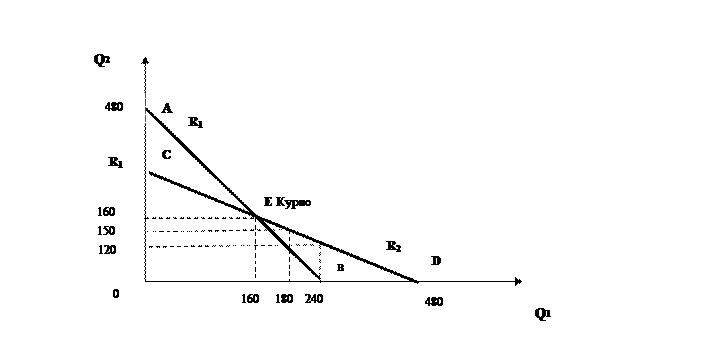 Якщо на ринок виходить тільки фірма 1, то як монополіст, вона вибирає обсяг випуску Qm = 240. Фірма 2, виходячи на ринок, у своїй стратегії керуватиметься фіксованим обсягом пропозиції 240 і з огляду на свою криву реагування R2 визначить обсяг Q = 120. Тоді фірма 1, виходячи з цього обсягу і своєї кривої реагування R1, визначить обсяг Q = 180. Фірма 2 відповідає обсягу Q = 150. Цей процес триватиме доти, доки фірми не зійдуться на обсязі Q1 = Q2 = 160 (точка Е). Якщо порівняти цей обсяг з обсягом конкурентної рівноваги (QК = 480), то ми бачимо, що кожна фірма в стані рівноваги Курно (точка E Курно рис. 8.3.) забезпечує тільки третину ефективного конкурентного обсягу, а галузь за дуополії Курно випускає ⅔ конкурентного обсягу, чиста монополія забезпечує тільки ½ цього обсягу. Таким чином, конкуренція за обсягами у моделі Курно не приводить ринок до стану конкурентної рівноваги (на відміну від моделі Бертрана).