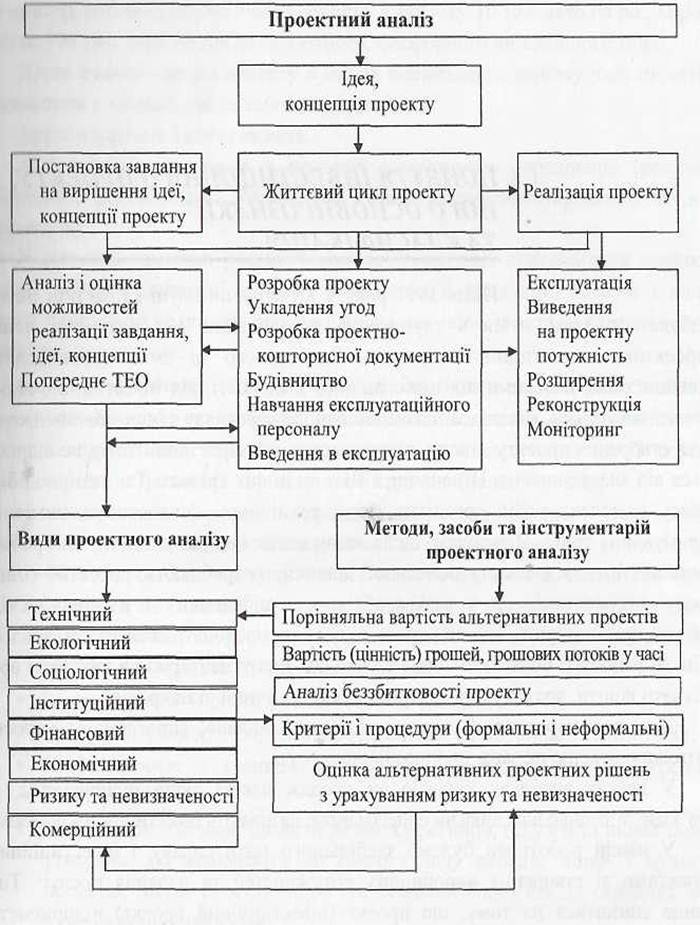 Предметом вивчення курсу «Проектний аналіз» є методологія та інструментарій аналізу проектних рішень. Ефективність використання капітальних вкладень і фінансових інвестицій залежить від впливу значної кількості різноманітних організаційно-економічних, технічних і фінансових чинників. Це вимагає ретельного обґрунтування розробки і оцінки кожного проекту новостворюваного підприємства, технології, комплексу чи об'єкта, їх реконструкції або модернізації, тобто виконання проектного аналізу. Проектний аналіз — це сукупність методів і прийомів, за допомогою яких можна розробити оптимальний проект у документальному вигляді і визначити умови його успішної реалізації Проектний аналіз є синтезом знань з різних наукових дисциплін, сфокусованих на розв'язанні проблеми вибору найкращого економічного розвитку, чи стосується це суспільства, чи підприємства. Проектний аналіз слід розуміти як динамічний процес, що відбувається у двох площинах — часовій і предметній. У часовій площині провадяться роботи, які забезпечують процес розвитку проекту, починаючи від виникнення самої ідеї проекту і до його завершення. У предметній площині здійснюється аналіз і розробка проекту в різних змістових аспектах. Сполучною ланкою цих площин є особлива трійця, до якої входять мета проекту, реально доступні ресурси та організаційні заходи. Таким чином, проектний аналіз є інструментом планування й розвитку будь-якої діяльності. При цьому концепція проектного аналізу розглядає проект як процес, котрий складається з ряду послідовних стадій, і як структуру, елементами якої є цілі, ресурси та заходи. 1.2. ОСНОВНІ СКЛАДОВІ ПРОЕКТНОГО АНАЛІЗУ Основними складовими проектного аналізу, що їх потрібно вивчити і дослідити, є: • ідея, концепція проекту; • життєвий цикл проекту; • принципи і критерії відбору та оцінки проекту; • види аналізів; • методологія проектного аналізу. Детальніше зміст проектного аналізу відображає принципова схема, що наведена на рис. 1.1. На підставі або в розрізі ідеї проекту розробляють його концепцію. Концепція проектного аналізу - це набір відповідних принципів, способів і методів визначення інвестиційних пріоритетів для прийняття рішення про реалізацію проекту. Проектний аналіз перш за все базується на порівнянні в грошовому виразі «вигод і витрат», пов'язаних з реалізацією проекту. Це зумовлено потребою враховувати часовий період, оскільки здійснення витрат відбувається сьогодні, а отримання вигод (особливо проекти з тривалим терміном спорудження) - через тривалий період (через роки). . Проектний аналіз повинен охоплювати різні аспекти проекту (економічні, екологічні, соціологічні, інституційні, технічні і комерційні) і вплив їх на оточення, що може виходити далеко за межі проекту і породжувати проблеми суспільного спрямування. Одним із принципів, на які опирається проектний аналіз, є принцип альтернативності. Він характеризується вибором найкращого варіанта з наявно можливих. Іншим принципом проектного аналізу є розгляд кількісного значення впливу змін, що співвідносяться з прийняттям чи відхиленням проекту. Цей принцип називається маржинальним, або принципом прирістної природи. 1.3. ЦІННІСТЬ ГРОШЕЙ У ЧАСІ, ТЕПЕРІШНЯ І МАЙБУТНЯ ВАРТІСТЬ Один із принципів проектного аналізу полягає в тому, що потрібно порівняти 