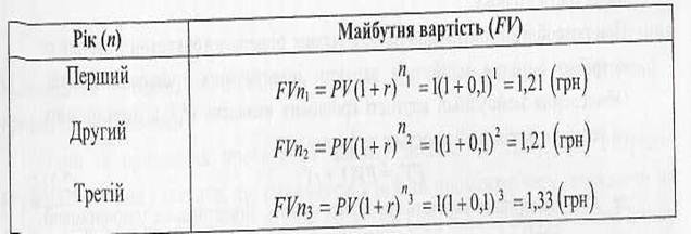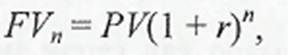 Процес зростання основної суми вкладу за рахунок нагромадження відсотків називається нарахуванням складного відсотка. А сума, отримана в результаті нагромадження відсотків, називається майбутньою вартістю суми вкладу, на який після закінчення періоду здійснюється нарахування. Початкова ж сума вкладу називається теперішньою, або поточною, вартістю. Процес переходу від теперішньої вартості до майбутньої називається компаундуванням. Компаундування (нарощування) - це операція визначення величини остаточної майбутньої вартості за допомогою складних процентів. Приклад 1.1. Ми поклали в банк на три роки 1 грв. за ставкою 10% на рік. Це означає, що теперішня вартість становить 1 грн. Якою ж вона буде після третього року? При розробленні оптимальних фінансових рішень у конкретних ситуаціях потрібно оцінити майбутню вартість інвестованих грошових коштів. Обчислення майбутньої вартості грошових вкладень (FVn), інвестованих на термін n років, здійснюється за формулою: