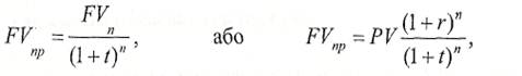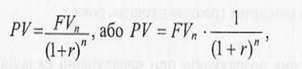 де P V- теперішня вартість грошових коштів, інвестованих у початковий період, грош. од.; r- процентна ставка в теперішньому, або реальному, значенні, коефіцієнт; n - кількість періодів, на які роблять вкладення (рік, квартал, місяць, день);