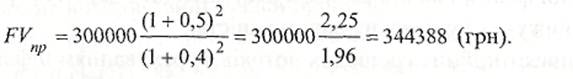 або ж номінальна сума грошових коштів зменшується в Приклад 1.5. Нехай номінальна ставка процента з урахуванням інфляції становить 50%, а очікуваний темп інфляції на рік - 40%. Визначити реальну майбутню вартість інвестицій 300 000 грн через два роки. Використовуючи формулу (2.5), отримаємо: