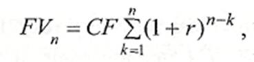 де- CF - періодичні надходження (відрахування) рівних за величиною грошових потоків k- номер періоду, в якому розглядається грошовий потік; FVn - номінальна майбутня вартість грошей з урахуванням інфляції; n - кількість періодів, на які робляться вкладення (рік, квартал, місяць, день);