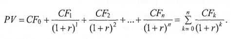 У фінансових розрахунках часто виникає потреба оцінки теперішньої вартості грошових потоків PV. Метою такої процедури є визначення цінності майбутніх надходжень від реалізації того чи іншого проекту з позиції теперішнього часу. Процес конвертації запланованих до отримання (виплати) у майбутніх періодах грошових коштів у їх теперішню вартість називається операцією дисконтування. Процентна ставка r, що використовується для визначення теперішньої вартості (PV) у формулі 1.2, називається дисконтною ставкою,
