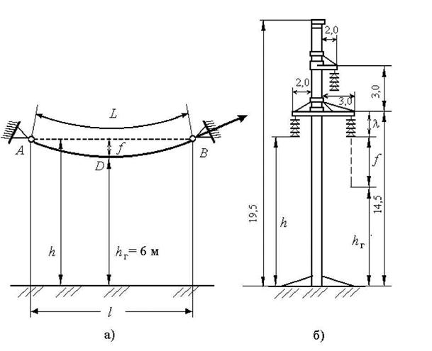 Рис.4.2 Воздушная одноцепная линия: а) схема пролёта; б) размеры промежуточной опоры где кв - поправочный коэффициент на диаметр провода d, мм: