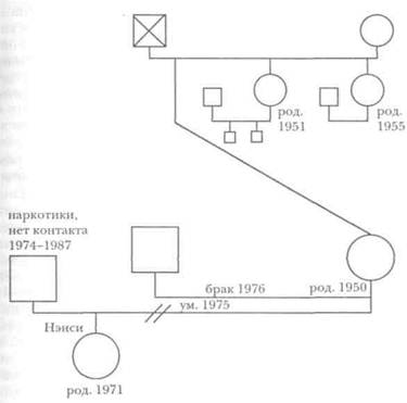 Рис. 4. Диаграмма семьи Г. ником на вечеринке, когда ей было 15 лет. Развернутый анализ показал, что первопричиной депрессии Нэнси можно считать депрессию ее матери. Депрессия достигла наибольшей остроты, когда Нэнси было от трех до шести лет, в эти годы брак ее родителей разваливался. Вдобавок контакты девочки с отцом были оборваны, поскольку он принимал наркотики. Потеря Нэнси отца повторяла ситуацию с ее матерью, отец которой умер, когда она была еще в юном возрасте. Таким образом, ситуация ранней потери отца, а также тесная связь с депрессивной матерью проявились по меньшей мере в трех поколениях. Когда передача тревоги, накопленной в нескольких поколениях, направлена на разрыв, то одним из возможных последствий этого