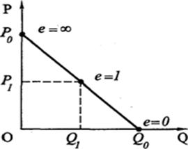 Эластичность этой функции изменяется в зависимости от уровня цены: если цена стремится к нулю, эластичность также стремится к нулю (в точке Q0). По мере возрастания цены и ее приближения к Р0, эластичность стремится к бесконечности. В середине этого интервала (при Р1=Р0/2), коэффициент эластичности равен -1. Для цен выше цены Р1 соответствующей объему спроса ОQ1, ценовая эластичность больше 1, для цен ниже P1 – спрос неэластичен. Как видно, эластичность спроса выше при высоких и средних ценах и ниже – при низких ценах. Отсюда следует, что если функция спроса является линейной, а ее график представляет собой прямую линию, то эластичность принимает различные значения в каждой точке графика. Следовательно, без предварительного измерения невозможно сказать, является ли в данной точке спрос эластичным или относительно неэластичным. Вместе с тем наблюдается связь между значением эластичности и наклоном линии спроса. При более пологой форме линии спроса величина коэффициента эластичности выше, чем в случае более крутой с точки зрения ее наклона линии спроса. Коэффициент эластичности – во всех случаях величина переменная при данной функции спроса. Однако бывают ситуации, когда эластичность спроса на всем протяжении какого-либо отрезка равна 1. В этом случае Р0Q0=P1Q1. График такой функции является равнобочной гиперболой и асимптотически приближается к осям координат, никогда не пересекаясь с ними.