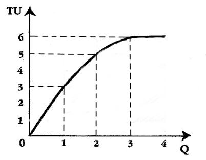 По мере увеличения непрерывного потребления данного блага его общая полезность (TU) хотя и растет, но скорость этого роста постоянно замедляется. Поэтому кривая TU становится выпуклой вверх. В точке С общая полезность достигает своего максимума, после чего кривая TU начинает снижаться. Такой характер движения TU обусловлен тем, что полезность у каждой последующей единицы товара оказывается ниже, чем у предыдущей. А в точке С, где обеспечивается полное насыщение конкретной потребности индивидуума, она (MU) достигает нулевого значения. Дальнейшее потребление товара будет связано уже с отрицательной полезностью, (с неприятными для индивидуума ощущениями, не с ощущением удовлетворения, а с ощущением вреда). Однако такая ситуация противоречит основным характеристикам человека экономического. Следовательно, то, что происходит за точкой С, мы не рассматриваем. Исходя из постулата о ненасыщаемости, экономический анализ потребительского повеления исходит из того, что предельная полезность – всегда положительная величина.
