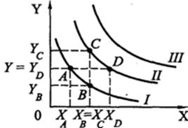 Поскольку точки А и В находятся на одной и той же кривой безразличия I, то наборы А и В следует рассматривать как равноценные (равнополезные) для того потребителя, для которого построены эти кривые безразличия. Набор С содержит наибольшее количество единиц товара Y (YС) и столько же, сколько набор В, единиц товара Х (ХС=ХВ). Товарный набор С предпочтительнее набора В, а следовательно, и набора А. Поскольку точки С и D лежат на одной и той же кривой безразличия II, то это значит, что наборы С и D для данного потребителя являются равноценными. Точки кривой безразличия III содержат более предпочтительные наборы, чем наборы кривых I и II.