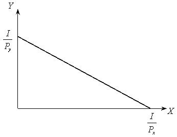 Кривые безразличия не учитывают экономические факторы потребительского выбора: цены товаров и доход потребителя. Бюджетное ограничение показывает, какие потребительские наборы можно приобрести на данную денежную сумму. Бюджетное ограничение (бюджетная линия) - линия, точки которой показывают наборы благ, при покупке которых потребительский бюджет (доход) расходуется полностью. Каждая точка демонстрирует количество товаров, покупка которых обойдется в одну и ту же сумму, равную доходу. Бюджетная линия пересекает оси координат в точках, показывающих максимально возможные количества благ, которые можно приобрести на данный доход при данных ценах. Если I - доход потребителя, Рх — цена блага Х, Рy – цена блага Y, а Х и Y составляют объемы купленных благ, то уравнение бюджетного ограничения: I=Рх*Х+Рy*Y. При Х=0, Y=I/Рy, т.е. весь доход потребителя расходуется на благо Y. При Y= 0, Х=I/Рх. Угол наклона бюджетной линии к горизонтальной оси = -PX/PY.