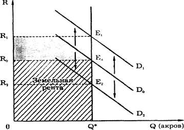 По горизонтальной оси отложено количество земли, по вертикальной – рента. Под ней мы понимаем количество денег, которую арендаторы ежемесячно выплачивают за каждую единицу земли (1 акр) владельцу земли. Кривая предложения идет перпендикулярно горизонтальной оси: количество земли не реагирует на ценностной показатель. Земли столько, сколько есть. Предложение земли абсолютно неэластично. Кривая спроса имеет отрицательный наклон в силу действия закон уменьшающегося плодородия. Этот закон – частный случай закона уменьшающейся отдачи факторов производства (снижения предельной отдачи, или снижения предельной производительности). Пересечение кривой спроса D0 с кривой предложения S показывает ситуацию равновесия на рынке земли. R0 – уровень ежемесячной ренты с 1 акра. Площадь прямоугольника 0Q*Е0R0 - - совокупная рента за всю используемую землю. Повышение спроса на продукт земли повысит ренту за 1 акр с R0 до R1. Это приведет к увеличению общей ренты до площади прямоугольника 0Q*E1R1. Снижение спроса на продукт земли приведет к уменьшению ренты за 1 акр с R0 до R2 и уменьшению общей ренты до площади 0Q*E2R2. Если бы величина земельной ренты была выше уровня равновесия, не все собственники нашли бы желающих взять их землю в аренду. Следовательно, величина ренты уменьшилась, и собственники начали бы конкурировать за арендаторов. Это снизило бы величину ренты до равновесной. Если бы величина земельной ренты была ниже равновесной, арендаторы не получили бы требуемые им площади. Следовательно, обострившаяся вследствие ограничения предложения земли конкуренция подняла бы величину земельной ренты. Таким образом, наглядно видна зависимость абсолютной ренты от изменения спроса на землю, который является производным от спроса на продукт земли. Следовательно, в условиях неэластичного предложения земли абсолютная рента полностью зависит от изменения спроса. То, что собственник земли претендует на плату за ее использование, является ограничением доступа к земле. Эти деньги выплачиваются из полученного предпринимателем дохода, что уменьшает его прибыль и, следовательно, снижает возможности капитализации прибыли. Следовательно, наличие собственности на землю снижает эффективность хозяйствования на земле.