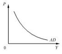 По оси абсцисс откладывается реальный объем производства (реальный ВНП по расходам). По оси ординат – уровень цен (дефлятор цен, индекс цен). Кривая совокупного спроса для закрытой экономики с государственным сектором показывает изменение совокупного (суммарного) уровня всех расходов экономики (домашних хозяйств, бизнеса и правительства) в зависимости от изменения уровня цен. Любая точка кривой показывает комбинацию объема выпуска и уровня цен, при котором товарный и денежный рынки находятся в равновесии. Факторы, приводящие к смещению кривой совокупного спроса (напомним, что ценовые факторы приводят к движению от одной точки к другой по данной кривой AD): 1. Увеличение денежной массы (увеличение предложения денег или скорости их обращения) – приводит к правостороннему смещению (AD2). 2. Потребительские расходы, которые зависят от следующих параметров: 3. Благосостояния потребителей. При увеличении благосостояния увеличиваются потребительские расходы, что ведет к правостороннему смещению (AD2); 4. Ожидания потребителей. Если ожидается увеличение реальных доходов, то увеличиваются расходы в текущем периоде, и происходит правостороннее смещение (AD2). К аналогичным последствиям приводят инфляционные ожидания; 5. Задолженность потребителя. Долги снижают текущее потребление и приводят к левостороннему смещению (AD1); 6. Налоги. Высокие налоги снижают совокупный спрос, приводят к левостороннему смещению (AD1). 7. Инвестиционные расходы, которые зависят от: a) Изменения процентных ставок. Увеличение процентной ставки приведет к снижению инвестиционных расходов и соответственно снижению совокупного спроса, приводит к левостороннему смещению (AD1); b) Ожидаемой прибыли от инвестиций. При благоприятном прогнозе прибыли, высокой номе ожидаемой прибыли увеличивается AD и идет правостороннее смещение (AD2); c) Налогов с предприятий. При повышении налогов снижается AD и идет и происходит левостороннее смещение (AD1); d) Внедрения новых технологий. Обычно они приводят к увеличению инвестиционных расходов и росту совокупного спроса, происходит правостороннее смещение (AD2); e) Наличия избыточных производственных мощностей. Если имеющиеся производственные мощности используются не полностью, то нет стимула к введению дополнительных мощностей. Следовательно, снижаются инвестиционные расходы, и сокращается AD, происходит левостороннее смещение (AD1). 8. Увеличение государственных расходов - приводит к правостороннему смещению (AD2). 9. Сокращение экспорта (например, вследствие изменения конъюнктуры мирового рынка) - приводит к левостороннему смещению (AD1). 10. Уровень национального дохода других стран. Если он растет, то эти страны увеличивают закупки за границей и тем самым способствуют увеличению совокупного спроса в данной стране, происходит правостороннее смещение (AD2). 11. Валютные курсы. Если курс на собственную валюту растет, то страна может больше закупать иностранных товаров, а это ведет к увеличению AD.