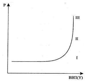 Совокупное предложение (AS – aggregate supply) – общее количество товаров и услуг, произведенное в экономике (ВНП по доходам). Кривая совокупного предложения показывает, какой объем совокупного выпуска может быть предложен на рынок производителями при разных значениях уровня цен, то есть отражает изменения реального объема производства конечных товаров в связи с изменением уровня цен. Форма кривой AS специфична. В целом наклон графика положительный, так как более высокий уровень цен побуждает фирмы наращивать производство. Однако кривая AS состоит из трех различных по характеру участков: горизонтального (I), промежуточного (II) и вертикального (III). Это связано с тем, что в экономике могут возникнуть три различные ситуации: неполная занятость ресурсов, приближение к полной занятости и полная занятость ресурсов.