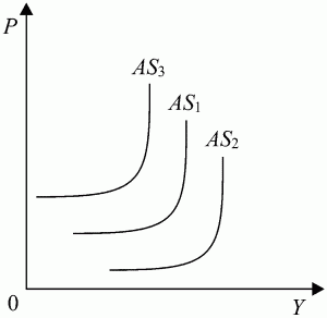 Изменения величины совокупного предложения под воздействием одного и того же фактора различны во временнóй интерпретации (кратко- или долгосрочной). Различие между краткосрочным (до 2-3 лет) и долгосрочным периодами в макроэкономике принято связывать главным образом с поведением номинальных и реальных переменных. В краткосрочном периоде номинальные величины (цены, номинальная заработная плата и т.п.) под воздействием рыночных колебаний изменяются медленно. Реальные величины (объем выпуска, уровень занятости, реальная процентная ставка) более гибкие. В долгосрочном периоде номинальные величины, наоборот, гибкие, а реальные меняются медленно. Горизонтальный участок (кейнсианский). Экономика находится в состоянии депрессии, ресурсы используются не полностью. Данная ситуация характерна для краткосрочного периода. Согласно концепции Кейнса, в этих условиях можно расширять производство, не опасаясь роста производственных издержек и роста цен на готовую продукцию, так как расширение производства идет за счет вовлечения незанятых ресурсов. Расширение совокупного спроса вызывает увеличение реального объема производства без повышения уровня цен. Промежуточный участок. Экономика находится в состоянии, приближающемся к полной занятости ресурсов. В отдельных отраслях ресурсы уже полностью заняты, в других отраслях наращивание производства за счет использования свободных ресурсов еще возможно. В целом расширение производства сопровождается повышением цен на факторы производства. Следовательно, растут издержки, и для сохранения прежнего уровня прибыльности фирмы повышают цены на продукцию. В данной ситуации увеличение объема производства сопровождается некоторым ростом цен. Вертикальный участок (классический). Экономика находится в состоянии полной занятости. Это соответствует неоклассической концепции, согласно которой рыночный механизм в автоматическом режиме обеспечивает полную занятость ресурсов. Данная ситуация характерна для долгосрочного периода. Если все ресурсы заняты, то все фирмы одновременно не могут увеличить объем производства. Для одной конкретной фирмы это возможно, но за счет привлечения новых ресурсов в ущерб другой фирме. Для привлечения дополнительных ресурсов данная фирма предлагает за них более высокие цены и, тем самым, уменьшает количество ресурсов, остающихся на долю других фирм, которые в итоге вынуждены сокращать производство и/или уходить с рынка. Возросшая конкуренция на рынке ресурсов стимулирует рост цен на них, в то время как общий объем выпуска в стране не меняется.