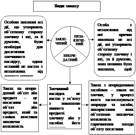 Рис. 19. Види замаху на злочин Закінчений замах визначений ст. 15 ч. 2 КК, яка вказує: «Замах на вчинення злочину є закінченим, якщо особа виконала усі дії, які вважала необхідними для доведення злочину до кінця, але злочин не було закінчено з причин, які не залежали від її волі». У матеріальних складах злочину це означає, що винний виконав всі можливі і необхідні за його розумінням дії, які повинні були викликати злочинний наслідок, але останній не настав з причин, що не залежали від волі та свідомості винного. Закінчений злочин буде мати місце, наприклад, у випадку, коли винний з метою вбивства вчинив влучний постріл у жертву, завдавши травму життєво важливим органам, однак смерть не настала в зв’язку із вчасною медичною допомогою, яка була надана потерпілому. Закінчений замах не може бути при вчиненні злочинів з формальним складом. Це визначається відомими характеристиками даного виду закінченого злочину, який має місце при виконанні винним в повному обсязі діяння, що характеризує об’єктивну сторону складу злочину. Незакінчений замах, згідно зі ст. 15 ч. 3, має місце тоді, коли «особа з причин, що не залежали від її волі, не вчинила усіх дій, які вважала необхідними для доведення злочину до кінця». Незакінчений замах має місце, наприклад, тоді, коли винний з метою викрадення грошей проник у приміщення, де стояв сейф, однак не зміг його відкрити. Незакінченість замаху може визначатись різноманітними факторами: відсутністю належних навиків у злочинця, його затриманням, активним опором потерпілого, вна- У теорії кримінального права виділяється як підвид незакін- ¨ замаху на непридатний об’єкт або предмет посягання; ¨ замаху з непридатними знаряддями або засобами. Ці види замаху по суті є різновидами фактичної помилки, які розглядались раніше. Замах на непридатний об’єкт або предмет посягання має місце тоді, коли як об’єкт або предмет злочинного посягання виступають суспільні відносини, блага та інтереси, речі матеріального світу, яким злочинець своїми діями об’єктивно не може спричинити шкоду. Наприклад, з метою вбивства злочинець робить постріл в особу, не орієнтуючись у тому, що потерпілий мертвий. Або інший випадок. Помиляючись, злочинець вчиняє викрадення пістолета, вважаючи його бойовим, тоді як насправді викрадає муляж зброї. Замах з непридатними знаряддями або засобами має місце у випадку застосування в процесі виконання об’єктивної сторони злочину знарядь та засобів, які не можуть спричинити наслідок, на який розраховує злочинець, що в цілому призводить до неможливості досягнення бажаного результату. Прикладом такого замаху може бути використання з метою вчинення вбивства як зброї несправної рушниці, спроба використати в процесі злочину автомобіль, який є несправним та ін. Всі види замаху, з точки зору їх кримінально-правової кваліфікації, розглядаються однаково. При цьому діяння, вчинене винним, кваліфікується за статтею Особливої частини Кримінального кодексу з посиланням на ст. 15 КК. 10.4. Добровільна відмова при незакінченому злочині З метою посилення превентивної сили кримінального закону, надання особам, які почали злочинну діяльність, останньої можливості уникнути кримінальної відповідальності та покарання КК України закріплює в своїх нормах інститут добровільної відмови від вчинення злочину. Стаття 17 ч. 