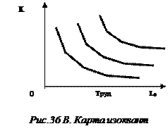 Карта изоквант – совокупность изоквант одной производственной функции, каждая из которых отвечает определенному объему выпуска продукции (рис. 36.в.). Карта изоквант может быть использована для того, чтобы показать возможности выбора среди множества вариантов организации производства в краткосрочном периоде, если капитал является постоянным фактором, а труд переменным. Изокванты показывают гибкость принимаемых фирмами решений по производству. В большинстве случаев фирмы могут добиться определенного выпуска продукции, используя различные сочетания производственных факторов. Руководитель фирмы должен понимать природу такой гибкости, так как это позволит ему выбирать такие сочетания производственных факторов, которые минимизируют издержки производства и максимизируют прибыль