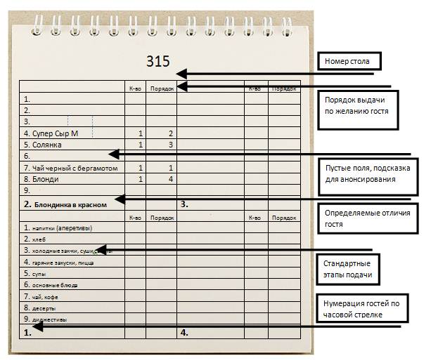 «БЛОКНОТ» В работе официанта есть безусловный плюс, когда удается не записывать, а запоминать заказы. С гостями устанавливается более тесный зрительный контакт. Но реальность такова, что если ваша память неидеальна, то это приведет к ошибкам. В такие моменты на столе перед вегетарианцем оказывается мясное рагу, а перед любителем текилы - джин. Не стоит потом удивляться, что клиенты не оставили и копейки в счет чаевых. Блокнот Официанта содержит максимальное количество полезной информации, чрезвычайно удобен в работе и представляет собой идеальный инструмент для официанта. ЗАПОЛНЕНИЕ БЛОКНОТА ОФИЦИАНТА